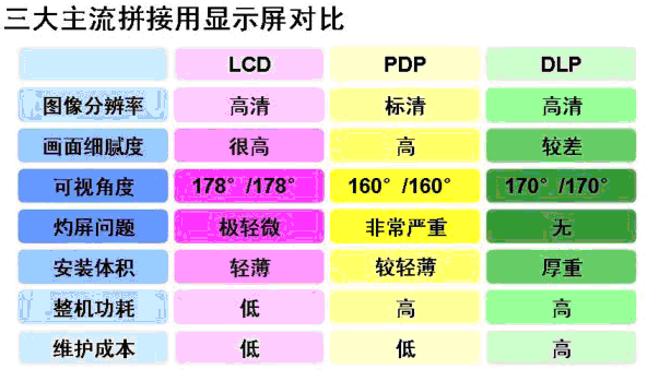 第一章 系统概述1.1. 系统设计指导思想大屏幕显示系统主要包括图像处理能力较强和显示效果很好的LCD拼接显示单元系统,以及与之配套的多屏外置图像处理器,支持单屏、跨屏以及整屏显示,实现图像窗口的缩放、移动、漫游、高分辨底图、网络抓图、网络集中与分散管理等功能。通过LCD拼接显示单元图像独特的处理方式,体现在多路信息的同步显示能力、系统的超强稳定工作能力和强大的软件支持能力。针对客户对大屏幕显示系统需求的特点,能够整套系统在满足标书技术要求的前提下,实现无可比拟的性价比。 1.2. 各种拼接墙的比较目前大规模屏幕拼接墙有三种: PDP等离子拼接、 DLP 背投拼接、LCD液晶拼接。