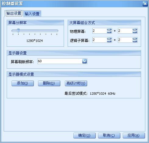 2、单击 “拼接”按钮 ,出现如图3所示对话框。根据实际应用情况,选择合适的屏幕分辨率,大屏幕组合方式及屏幕刷新频率,点击 “应用 — 确定” 。