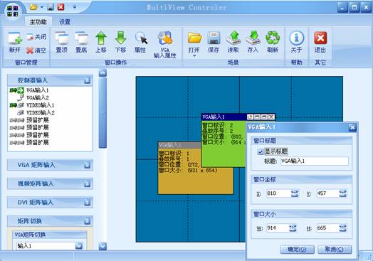 单击“主功能”选项卡,出现如图4所示的界面。从软件左边“控制器输入”中选择所开窗口的输入源,在控制软件的蓝色区域,按住鼠标左键,向右下方拖动,到了合适的位置后松开鼠标左键,或单击“新开”图标,在“窗口坐标”一栏中可以改变所开窗口的位置(以左上角顶点为基准);在“窗口大小”一栏中可以改变窗口的大小,单击“应用”。