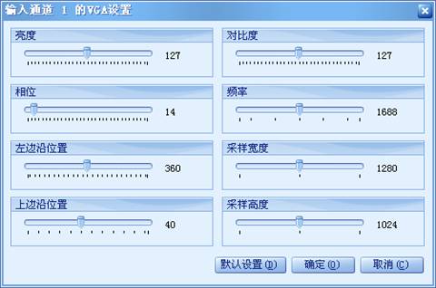 关于输入源的类型。若使用DVI或视频输入,则直接应用就可以。如果选择VGA输入,需单击“VGA输入属性”图标,出现如图5所示界面。通常情况下,用户不需要去调节,或只对“左边沿位置”和“上边沿位置”以及“相位“进行微调即可,其他参数不建议用户去更改。如果用户不小心错误调节了这些参数,可以点击“默认设置 — 应用” ,即可恢复默认设置。
