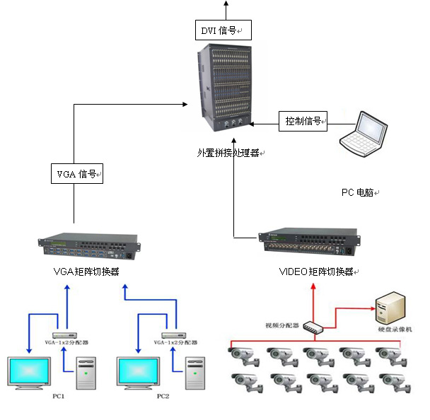 3)图像控制器的摆放应位于屏幕墙旁边或后面的通道(机柜内),应尽量靠近投影箱体的接口,减少VGA走线距离。