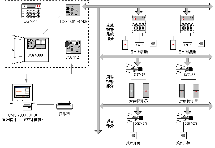 BOSCH的住宅小区联网报警系统主要是将DS-3MX / DS6MX-CHI配合到DS7400Xi-CHI系统里,通过总线方式连接,可以构成以下各种子系统:
