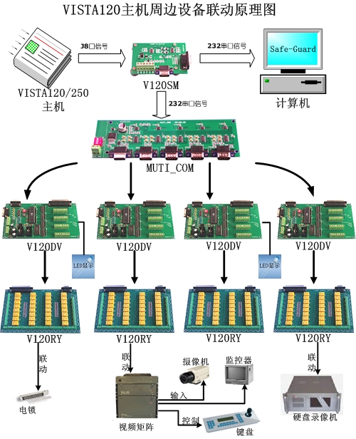- VISTA-120/250BP主机串口转换模块V120SM是针对安定宝VISTA-120/250BP报警主机的J8口设计的串口转换模块,它可以将收到的信号以232串口信号同时输出给计算机软件和V120DV显示驱动模块V120RY继电器输出模块,用来报警联动其他设备。